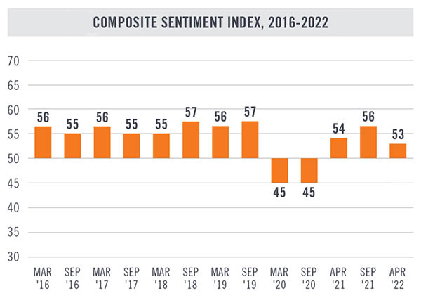 But what about the commercial real estate industry? The Commercial Real Estate Development Association’s Commercial Real Estate Sentiment Index (CRE) surveys real estate professionals to help make predictions about industry conditions over the next 12 months. As shown on the chart below, this year’s first-half reading of 53 points, which dates to April, is only down slightly from fall 2021, still falling below the pre-pandemic “normal” range. Survey respondents cited tempered expectations due to geopolitical and economic uncertainties like supply chain issues and inflation, however, the CRE indicates that these industry professionals still foresee commercial real estate conditions to improve over the next 12 months in spite of those uncertainties.