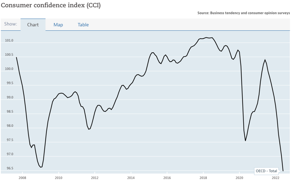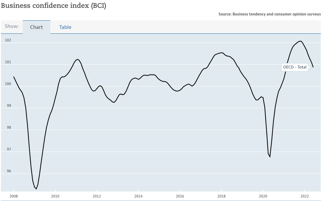 First, let’s take a look at the Organization for Economic Co-operation and Development’s business confidence index (BCI) and compare it to their consumer confidence index (CCI). The graphs below show information ranging from 2008 to 2022.